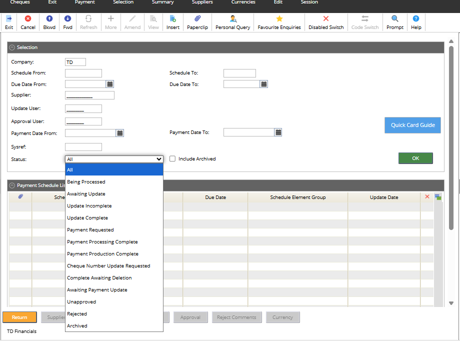 Accounts Payable>AP Processes>Payment Processing>Schedule Maintenance. There is a status drop down menu that will display different schedule statuses, or just select Search to view them all.
