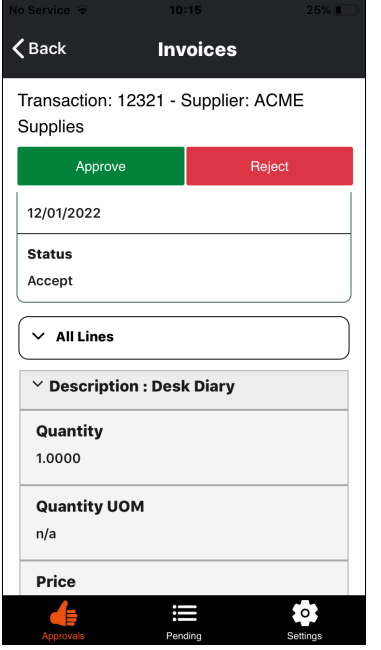 - Tap the All Lines or an individual line to display more details, such as GL accounts etc.