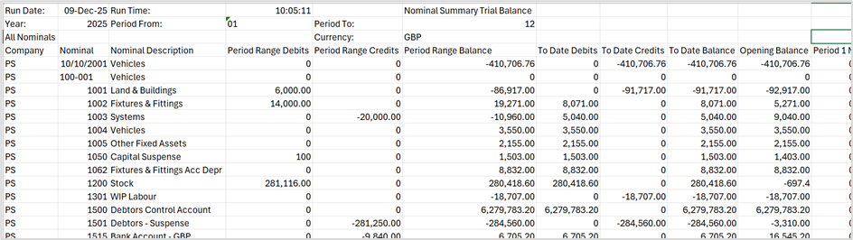 An on-line Trial Balance enquiry is available relating to the groups and categories defined for the company. To get a full company Trial Balance use the Account Details enquiry. If you enter % in the Nominal selection field, you will get a full unfiltered list of all nominal codes.