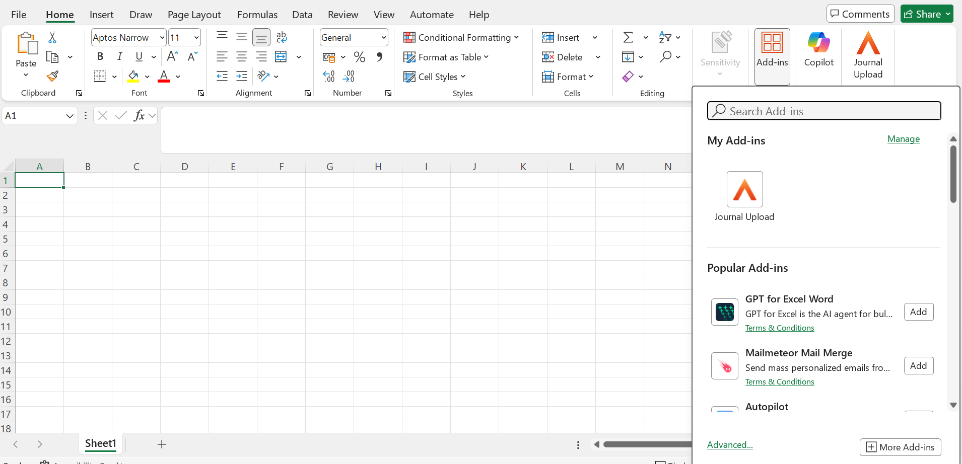 To install the Journal Upload Add-in for either Excel for the Web or Excel Desktop:-