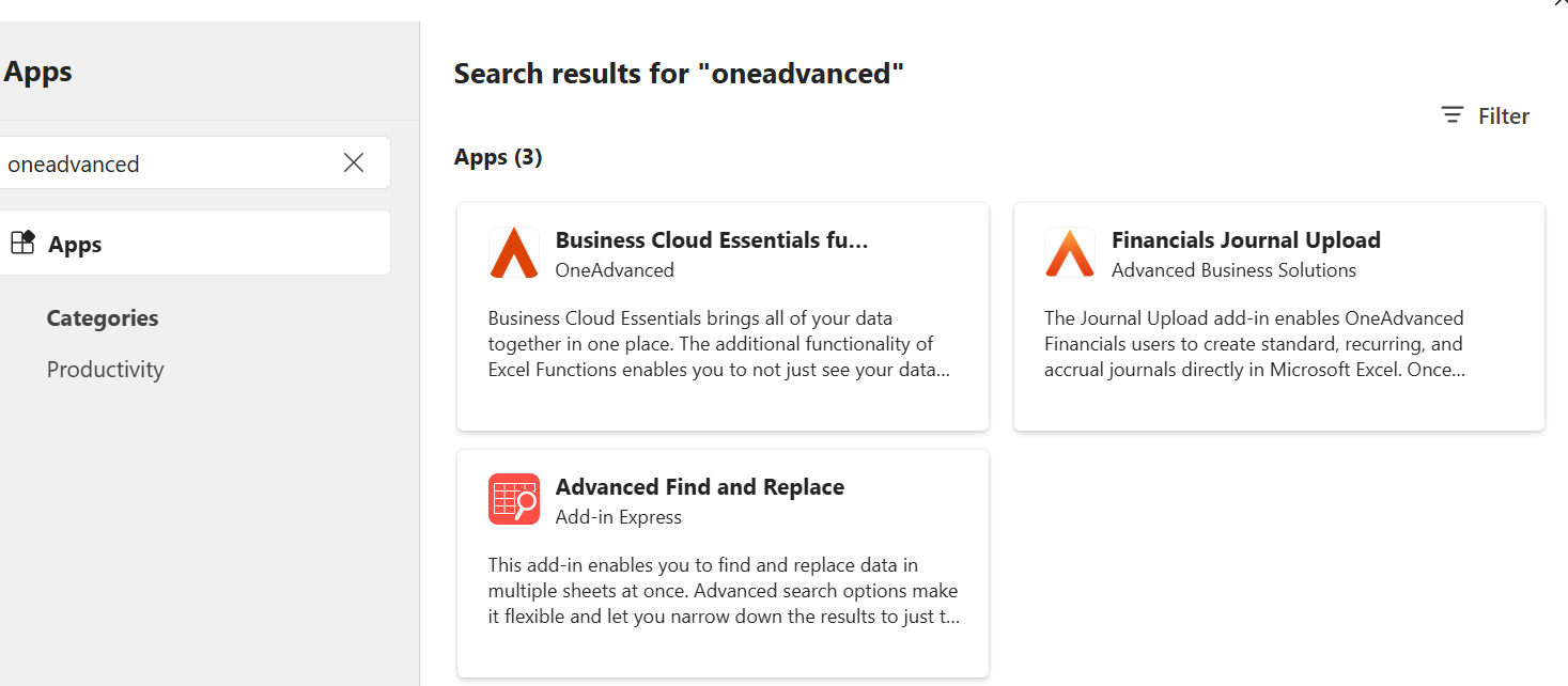 For both Web and Desktop, from the Office store, search for 'OneAdvanced' and the 'Financials – Journal Upload' will show in the available list: