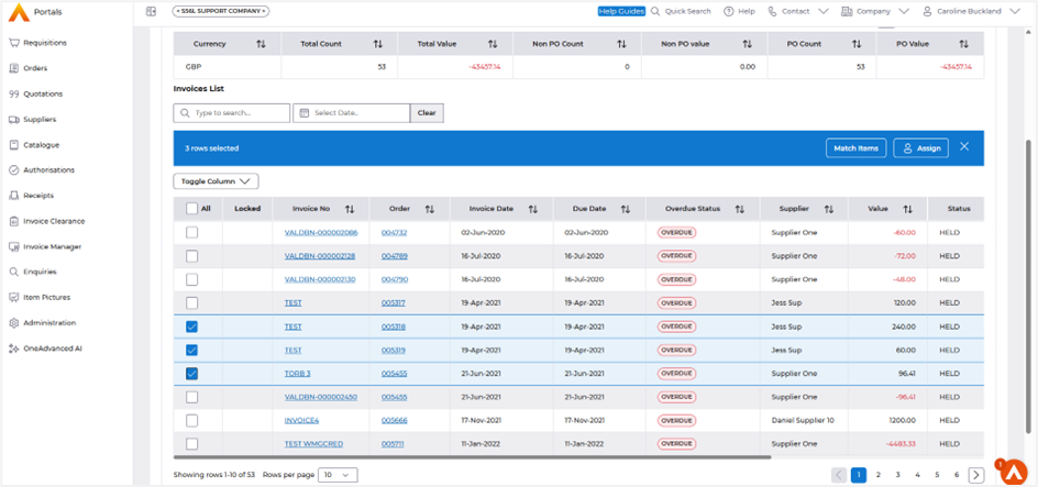 Held Invoices – multi select to allow the Match Item selection.