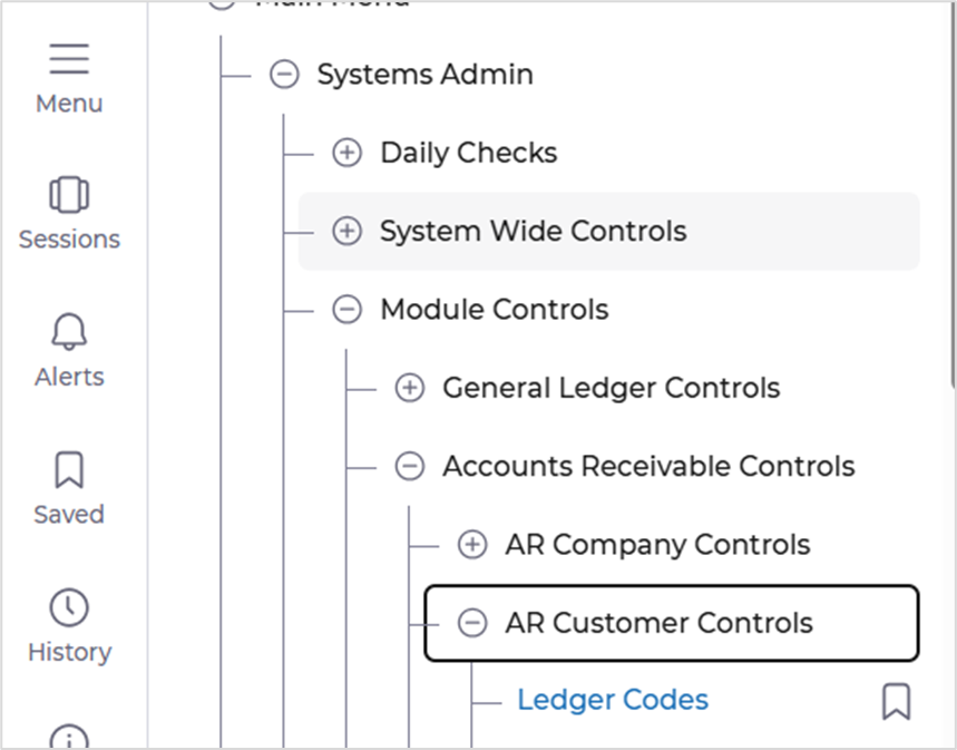 Systems Admin>Module Controls>Accounts Receivable Controls>AR Customer Controls>Ledger Controls.