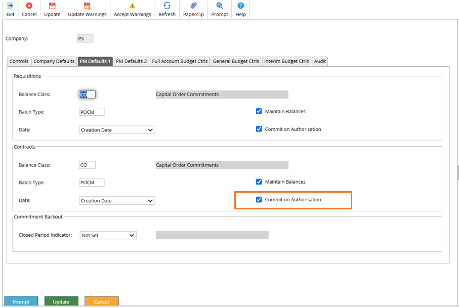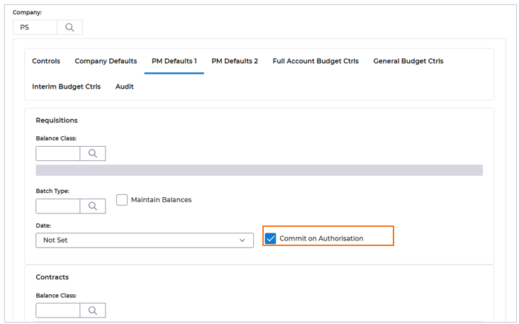 - Access the PM Defaults 1 tab. The Commit on Authorisation flag must be set on Commitment Accounting Company Controls, or on the requisition document code.