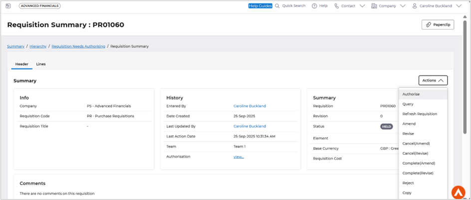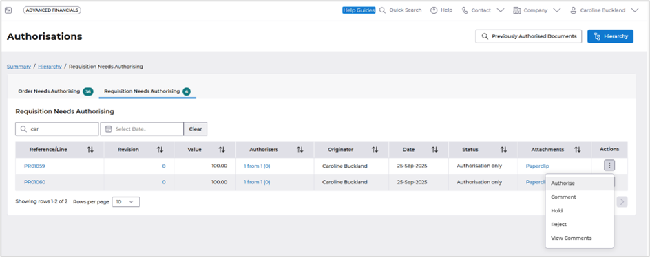 When accessing the Authorisations option, select the Authorise action against a requisition.