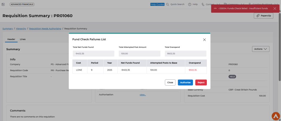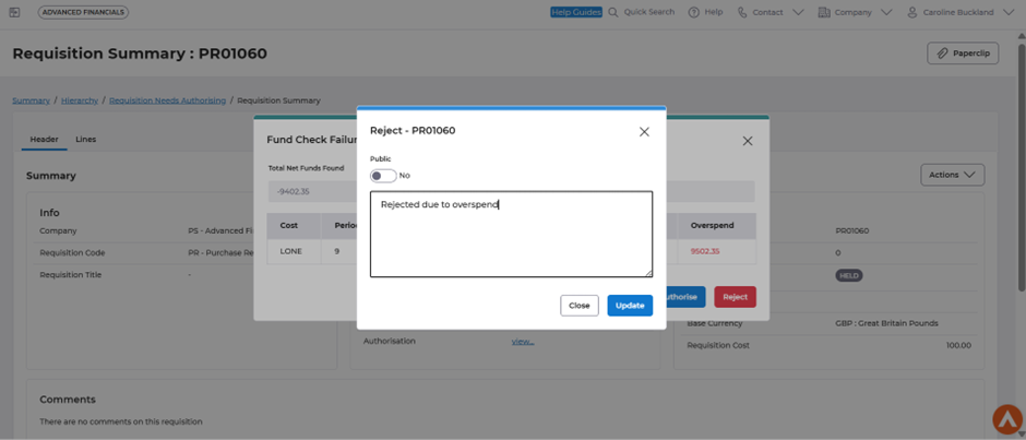 Select Close, to leave the requisition unauthorised or select Reject to reject the requisition.