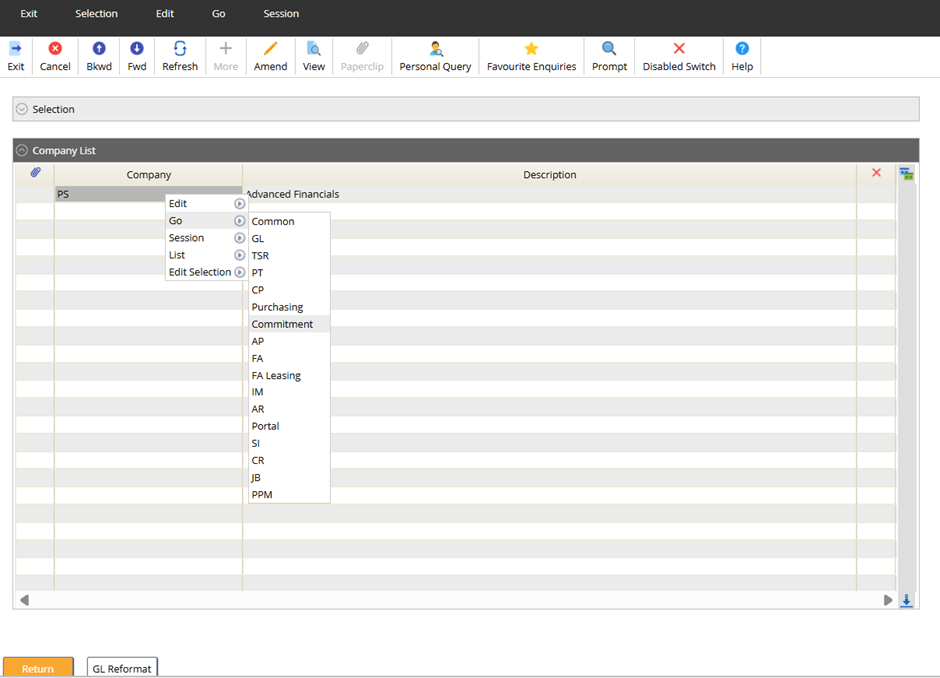 System Admin>Combined Company Controls, locate the company and use the Go>Commitment Control option.