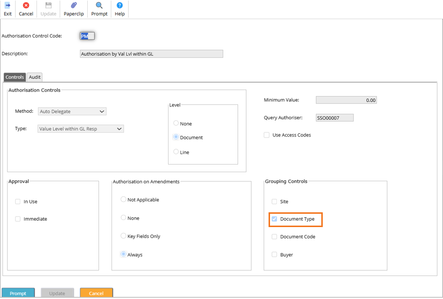 Menu access: Systems Admin>Module Controls>Purchasing Management Controls>Authorisation Controls>Authorisation Controls